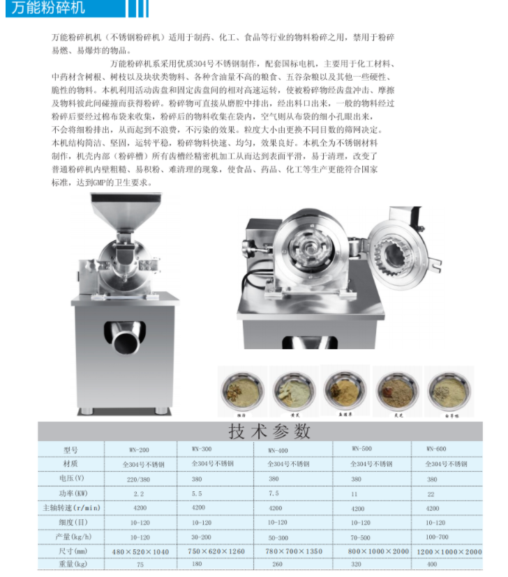 WN-200全能粉碎機產量10-120kg/h,不銹鋼制作,本機結構簡潔,堅固,運轉平穩,粉碎物料快速,均勻,效果良好。