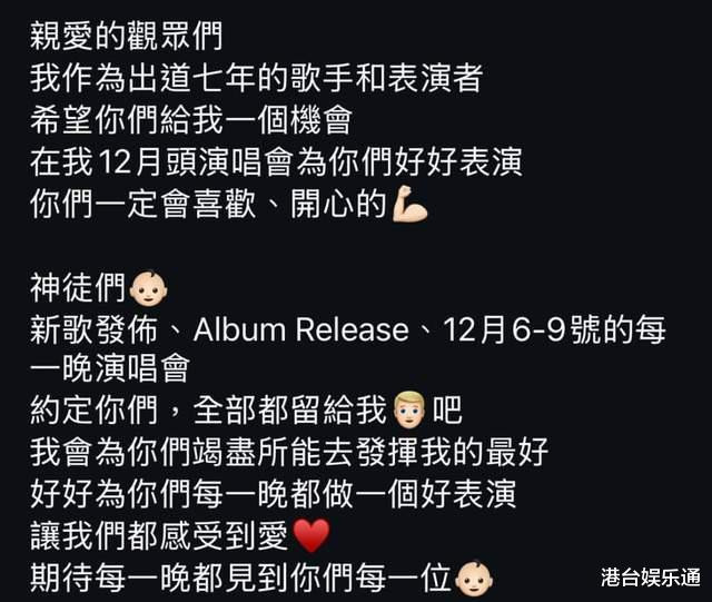 “亲爱的观众们,我作为出道七年的歌手和表演者,希望你们给我一个机会,在12月的演唱会上,我会为你们好好表演,你们一定会喜欢、开心的……12月6日-9日,每一晚演唱会,约定你们,(把时间)全部都留给我吧!我会为你们竭尽所能去发挥到最好,好好为你们每一晚都做好表演,让我们都感受到爱!期待每一晚都见到你们每一位。”